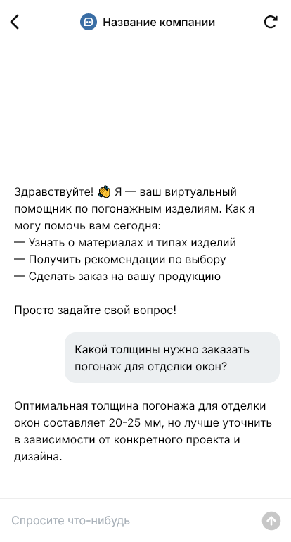 Внедрение делается под ваш ассортимент: плинтуса, наличники, рейки, раскладки, уголки, пороги, карнизы, профили, а также под ваши правила работы (наличие, сроки поставки, доставка, возвраты, акции). Бот может помогать выбирать замену при отсутствии товара и собирать фото/референсы, чтобы ускорить подбор.