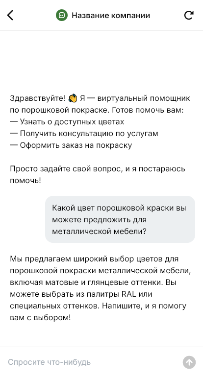 В поддержке бот отвечает на типовые вопросы, чем порошок лучше жидкой краски, как ухаживать за покрытием, можно ли красить оцинковку, что делать с алюминием. При претензиях бот принимает фото, описание дефекта и условия эксплуатации и передаёт специалисту, чтобы быстро разобраться и предложить решение.