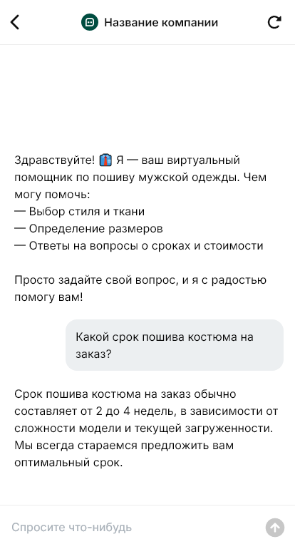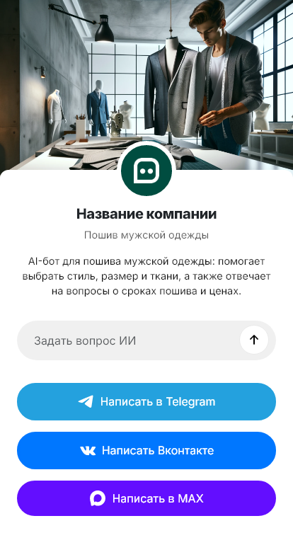 Индивидуальный пошив мужской одежды требует точности и дисциплины на старте. Клиенты спрашивают про стоимость костюма или пальто, сроки, ткани, количество примерок, особенности посадки, возможность срочного пошива и доработок. Но в переписке такие вопросы быстро распадаются на десятки сообщений, а мастерская теряет время на одно и то же. При этом клиенты часто выбирают по скорости и ясности ответа: кто объяснил процесс лучше, к тому и идут.