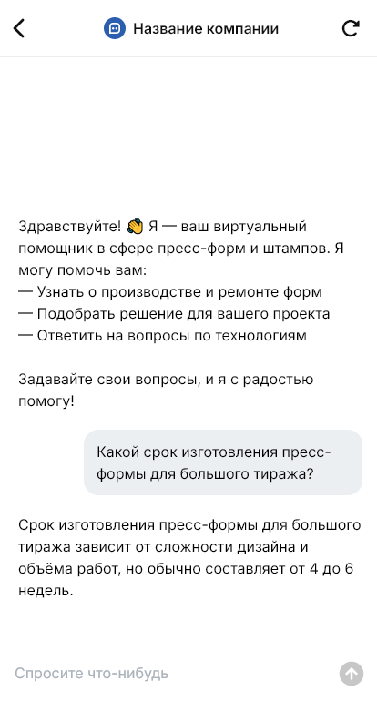 Дальше бот фиксирует сроки, бюджетный диапазон, этапность (концепт → проектирование → изготовление → тестовая партия → доработка), а также вопросы по обслуживанию и ремонту оснастки. Для штампов бот уточняет материал листа, толщину, тип операций, количество позиций, требования к подаче и съёму, потому что эти детали определяют конструкцию и стоимость.