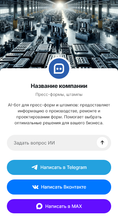 Бот для изготовления пресс-форм и штампов помогает собрать технические параметры так, чтобы конструктор мог быстро оценить сложность. Он уточняет, что производим (деталь, изделие), материал и технологию (литьё под давлением, штамповка, вырубка), требуемую производительность, ресурс оснастки, требования по точности и поверхности, наличие 3D-модели или чертежей, тип оборудования заказчика и ограничения по установке. Бот может попросить файлы STEP/IGES, чертежи, фото образца и информацию по предыдущей оснастке.