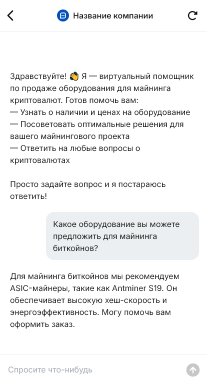 Бот для продажи майнингового оборудования помогает квалифицировать запрос и собрать вводные. Он уточняет бюджет, где будет размещение (квартира/частный дом/помещение), доступную мощность и тариф на электроэнергию, допустимый шум и тепло, предпочтительный формат (одно устройство или ферма), цели (тест, масштабирование), сроки. Бот может предложить варианты оборудования, объяснить требования к электрике и охлаждению, и довести клиента до консультации с инженером.
