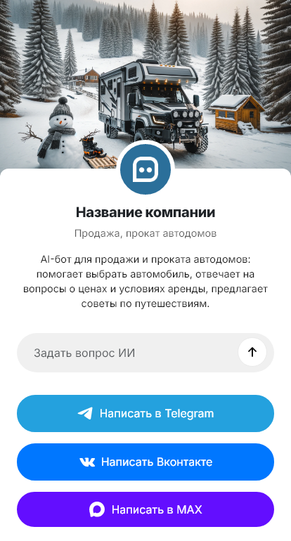 Внедрение настраивается под ваш парк и продажи: модели, комплектации, календарь доступности, цены, залоги, страховки, пробег, интеграция с CRM и оплатой. Бот может отправлять инструкции по получению автодома, чек-лист осмотра, правила возврата и памятку по эксплуатации. Для покупателей бот собирает требования и помогает подготовить предложение по комплектации и финансированию.
