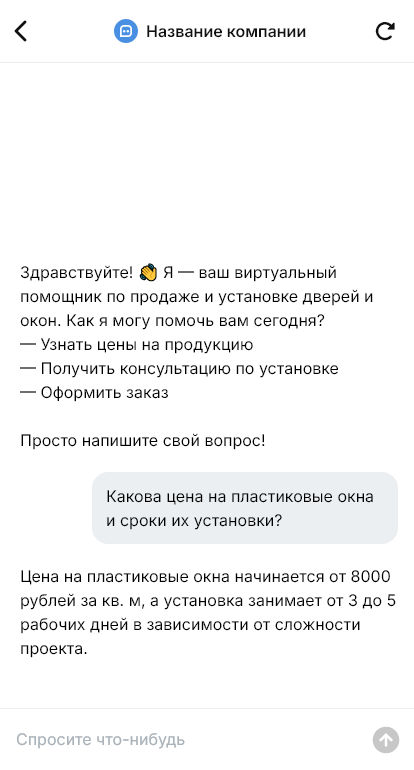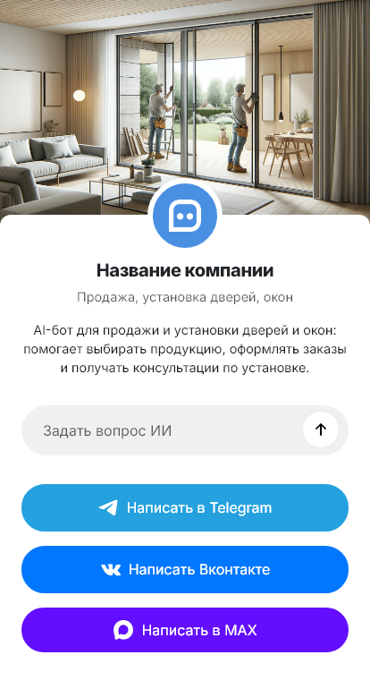 Решение внедряется с учётом специфики вашей компании: прайс-логики, акций, рассрочки, географии выездов, графика бригад и типовых сценариев продаж. Можно настроить разные ветки для частных клиентов и для объектов (строители, подрядчики, управляющие компании), а также добавить сбор документов и реквизитов для B2B.