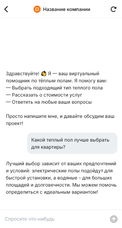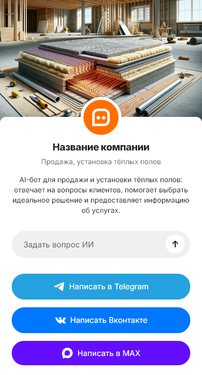 При выборе тёплых полов клиенты задают много вопросов: что лучше — кабель, маты или инфракрасная плёнка, подходит ли под плитку или ламинат, сколько потребляет электричества, какой терморегулятор выбрать, сколько стоит монтаж. Люди часто пишут вечером, когда планируют ремонт, и ждут быстрый и понятный ответ. Бот для продажи и установки тёплых полов помогает автоматизировать первичную консультацию и доводить клиента до замера и сметы.
