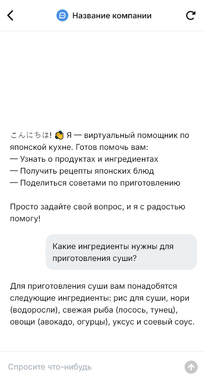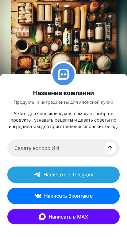В итоге ингредиенты продаются стабильнее, потому что клиент получает понятный подбор и быстрый заказ. Бот работает в Telegram, VK, MAX и на сайте, превращая интерес к японской кухне в оформленные покупки.
