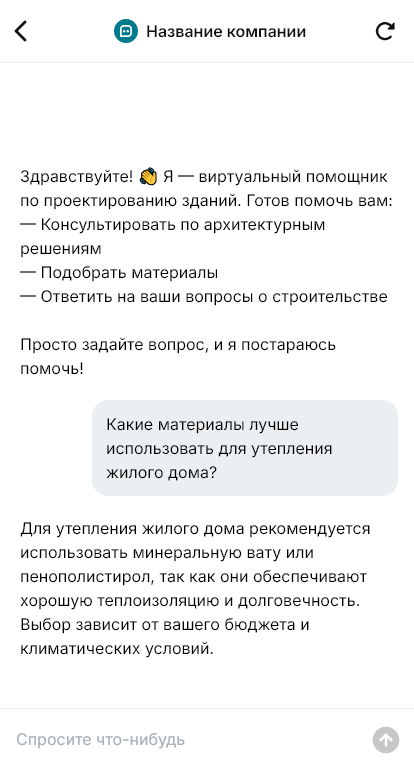 Чат-бот уточняет тип здания и назначение, местоположение, параметры (этажность, площадь, назначение помещений), стадийность и предполагаемые сроки. Затем бот собирает сведения об участке, ограничениях и коммуникациях, запрашивает документы (ГПЗУ, ТУ, исходники, эскизы) и формирует структурированное техническое задание. По итогам бот объясняет процесс: этапы проектирования, состав разделов, взаимодействие с экспертизой и сроки выдачи документации.