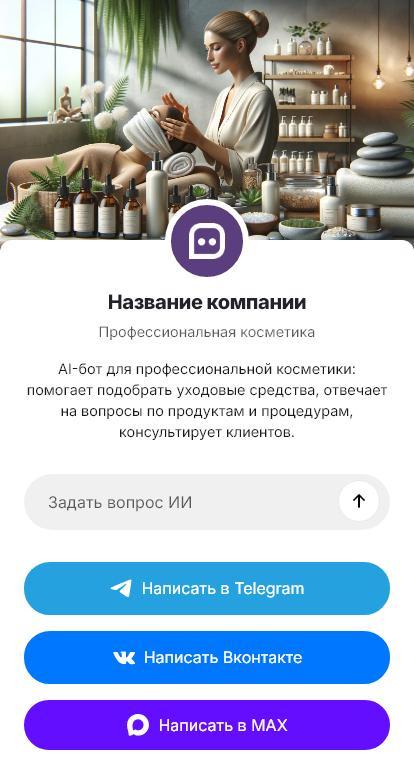 В итоге профессиональная косметика закупается быстрее и стабильнее. Бот работает в Telegram, VK, MAX и на сайте, превращая вопросы о линейках в точные заявки и регулярные закупки.