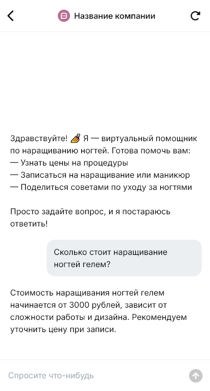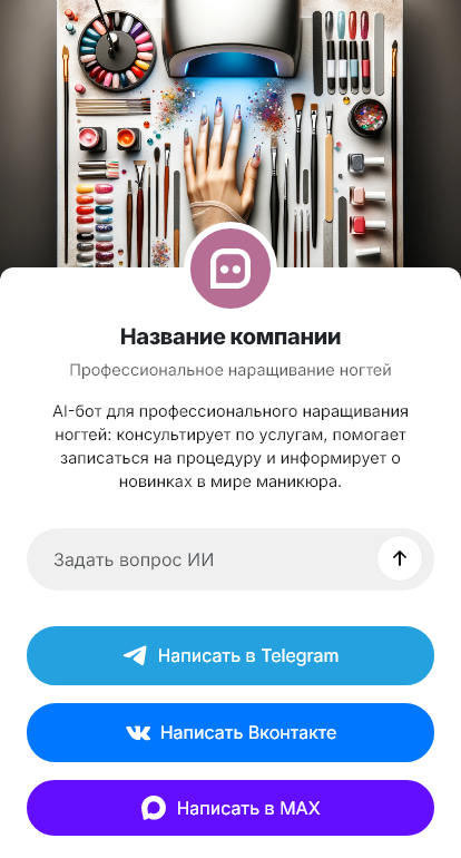 Внедрение настраивается под студию: прайс и пакеты «наращивание + покрытие», длительность по уровню сложности, правила подготовки и ухода, условия гарантии/коррекции, интеграция с записью и CRM. Бот помогает подтверждать визиты, напоминать о коррекции, поддерживать клиента в регулярном цикле ухода.