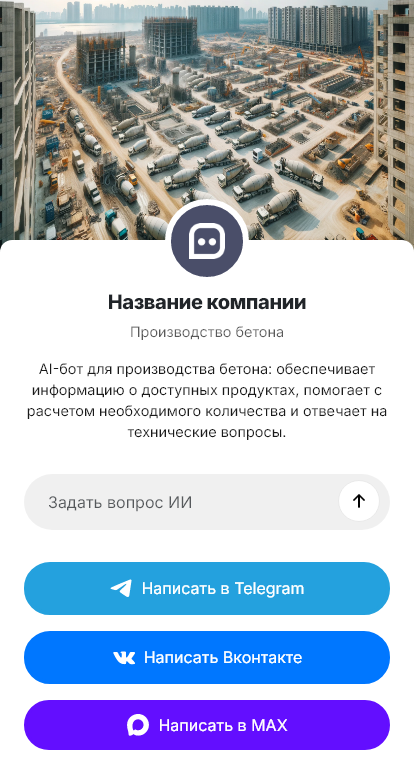 В итоге производство бетона получает больше заказов и меньше потерь на этапе первого контакта. Бот работает в Telegram, VK, MAX и на сайте, превращая сообщения в заявки на поставку.