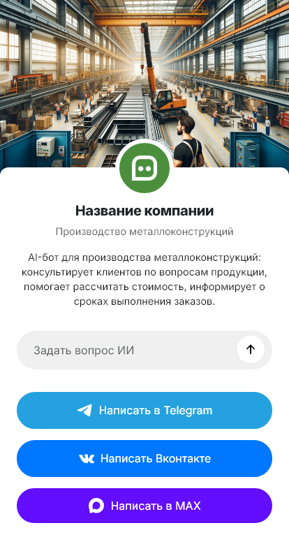 Бот для производства металлоконструкций помогает принять запрос и собрать ключевые данные. Он уточняет, что именно требуется (фермы, балки, колонны, лестницы, каркасы), объёмы, наличие чертежей, требования к покрытию (грунт/порошок/цинкование), сроки изготовления, нужна ли доставка и монтаж. Бот может попросить загрузить чертежи и ведомости, чтобы технолог быстро оценил производство.