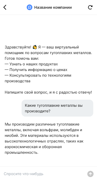 Бот для компании, работающей с тугоплавкими металлами, помогает структурировать запрос и собрать нужные данные. Он уточняет материал и марку, форму поставки, размеры и допуски, требуемую чистоту, объёмы и регулярность, условия обработки и применения, требования к сертификатам и сопроводительным документам. Для проектных закупок бот может собрать информацию о конечном применении и критичных параметрах партии.