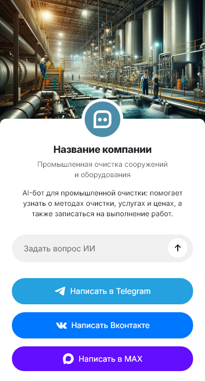 В итоге промышленная очистка продаётся быстрее и безопаснее. Бот работает в Telegram, VK, MAX и на сайте, повышает качество заявок, ускоряет выбор технологии и помогает довести клиента от первого обращения до закрытия проекта и следующего планового обслуживания.