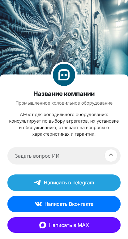 Бот для поставщика промышленного холода помогает собрать вводные для инженера. Он уточняет, что хранится (мясо, рыба, молочка, овощи, фарма), требуемые температуры и диапазоны, объём и размеры камер, тип дверей, частоту загрузки, наличие тамбура, требования к санитарии и мойке, условия помещения и вентиляции. Отдельно бот спрашивает про электропитание, ограничения по шуму, размещение наружных блоков и необходимость удалённого мониторинга.