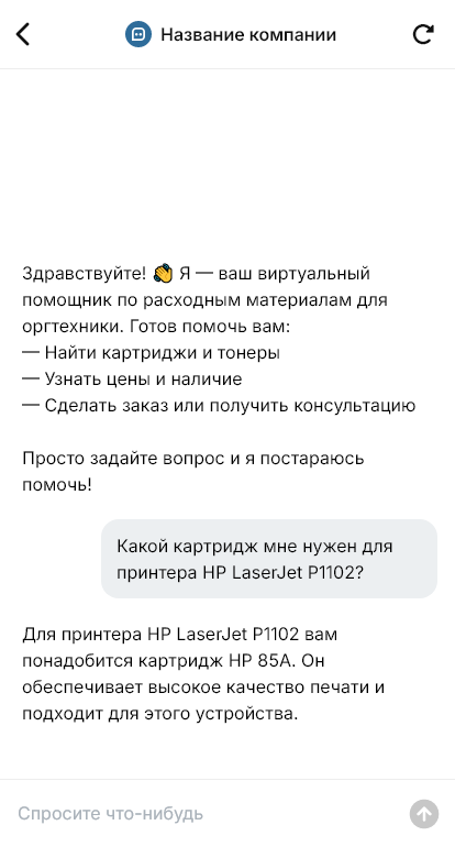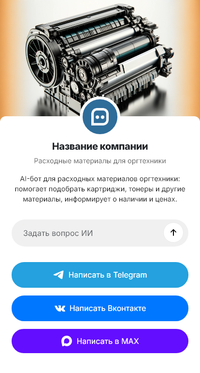 Чат-бот уточняет модель устройства или просит фото шильдика, предлагает совместимые расходники и аналоги, сообщает наличие и сроки, отвечает по доставке и оплате. Для корпоративных клиентов бот может собирать реквизиты и формировать заявку на счёт, а для постоянных — ускорять процесс по сценарию «повторить прошлый заказ».