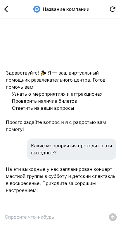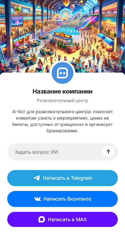 Развлекательный центр обычно объединяет сразу несколько активностей, поэтому посетители задают много вопросов. Какие зоны работают сегодня, сколько стоит вход, как купить билеты, есть ли семейные тарифы, как забронировать праздник, какие ограничения по возрасту и как добраться. В выходные и праздничные дни поток обращений резко возрастает, и сотрудники физически не успевают отвечать всем в чате и по телефону. В итоге часть клиентов не доходит до покупки, потому что не получила быстрых ответов.