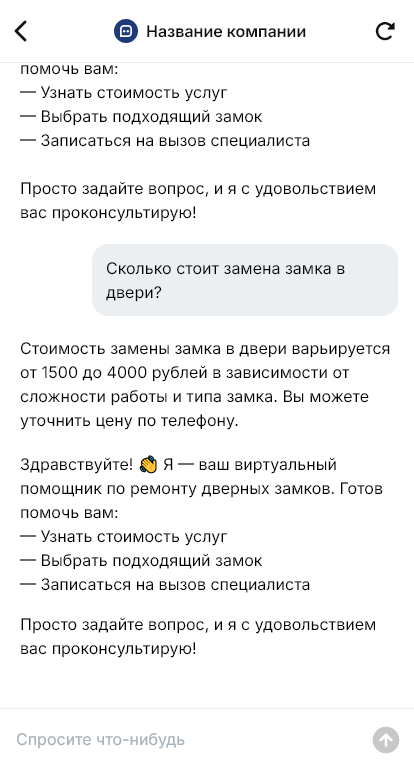 Бот помогает и в плановых обращениях. Например, когда нужно заменить личинки после переезда, поставить замок другого класса, усилить дверь или настроить плавность закрывания. Клиенту проще оформить заявку через короткий сценарий, чем объяснять все детали в свободной переписке и пересылать фотографии в разные чаты.