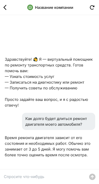 Внедрение настраивается под ваш бизнес: направления ремонта, прайс и ориентиры, расписание мастеров, интеграция с CRM/календарём, уведомления. Бот может выдавать памятки по подготовке к визиту, напоминания, а после — фиксировать согласование работ и статусы ремонта. Для корпоративных клиентов бот может вести заявки по автопарку и упрощать повторные обращения.