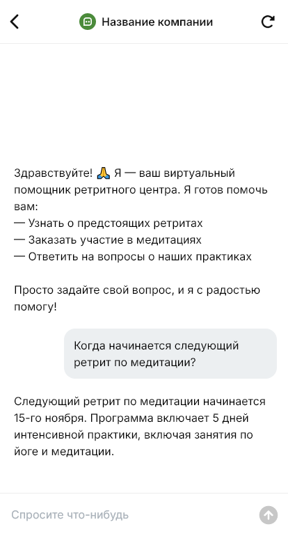 В ретритный центр люди приходят за восстановлением и смыслом, но на этапе выбора у них много практических вопросов. Какая программа, для кого она подходит, какая нагрузка, условия проживания, питание, что взять с собой, как добраться, можно ли без опыта медитации, какие есть ограничения по здоровью. Если отвечать на всё вручную, менеджер постоянно в переписке, а потенциальный участник теряется в деталях и откладывает решение.