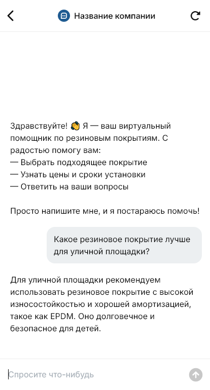 Чат-бот уточняет тип объекта и назначение покрытия, площадь, условия эксплуатации (улица/помещение), требования по амортизации и безопасности, желаемую толщину, цвет и рисунок, тип основания и необходимость подготовки. Далее бот объясняет варианты материалов (плитка, бесшовное покрытие, крошка), даёт ориентир по стоимости материалов и работ, рассказывает про этапы укладки и предлагает записаться на выезд/замер.