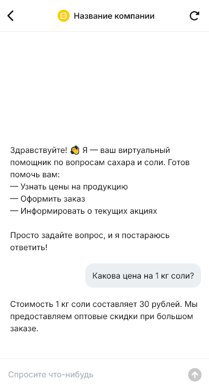 Сахар и соль кажутся простыми товарами, но в переписке у клиентов возникает много уточнений. Какая фасовка, есть ли крупная соль, йодированная, морская, какие бренды и упаковка, можно ли взять мешки для производства, сколько стоит доставка и к какому времени привезут. Вручную отвечать на такие вопросы несложно по одному, но при потоке сообщений это превращается в нагрузку, а часть покупателей не доводит заказ до оформления.