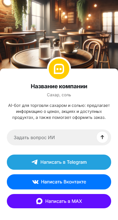 В итоге сахар и соль продаются стабильнее, потому что оформление заказа занимает минуты. Бот работает в Telegram, VK, MAX и на сайте, превращая вопросы о фасовке в оформленные покупки.