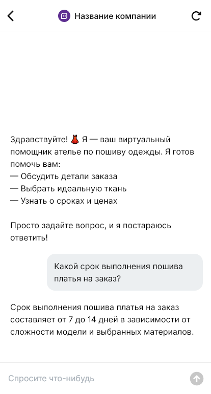 Внедрение настраивается под реальную работу салона: график и длительность примерок, правила предоплаты, этапы пошива, количество примерок, допустимые сроки, перечень работ по ремонту, стоимость в диапазонах, а также варианты доставки/самовывоза, если они есть. Благодаря этому бот не «отвечает общими фразами», а помогает сразу согласовать ожидания и ускорить принятие решения.