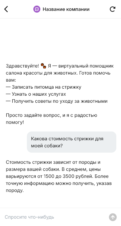Чат-бот уточняет вид питомца (собака/кошка), породу, вес/размер, состояние шерсти, что нужно сделать (стрижка, тримминг, мытьё, вычёсывание, когти, уши) и желаемые сроки. По сценарию бот может подсказать, как подготовиться к визиту, сколько примерно длится процедура, что влияет на цену (порода, густота шерсти, колтуны), и предложить свободные окна или варианты времени (в зависимости от вашей схемы записи).