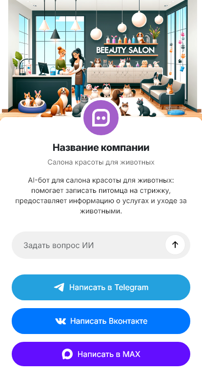 Бот работает в Telegram, ВК, MAX и на сайте 24/7, снижает нагрузку на администратора и повышает конверсию обращений в реальные записи в груминг-салон.