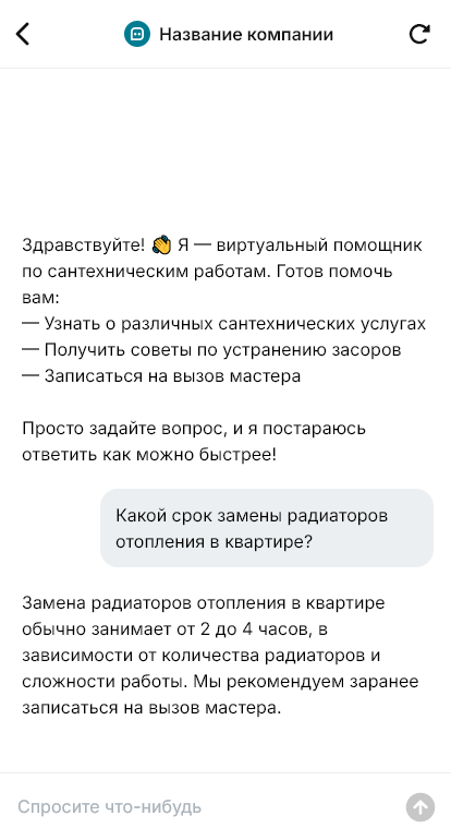 Внедрение выполняется под ваш перечень работ: аварийные выезды, плановые монтажи, замена коммуникаций, обслуживание для организаций. Можно добавить сбор реквизитов для B2B, оформление заявок на договор и закрывающие документы, а также сценарий повторных обращений с «быстрым заказом».
