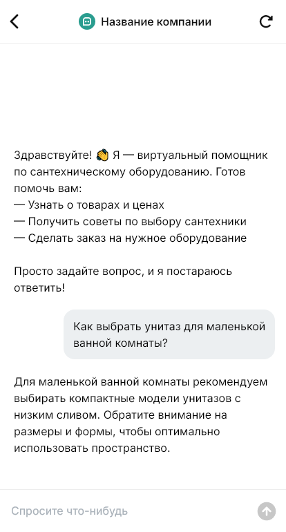 Внедрение делается под ваш каталог и правила продаж: товарные группы, связки «основной товар + комплектующие», акции, доставка, возвраты и гарантия. Можно добавить сценарии для «быстрой комплектации санузла» и отдельную ветку для профессионалов (скидки, счёт, реквизиты).