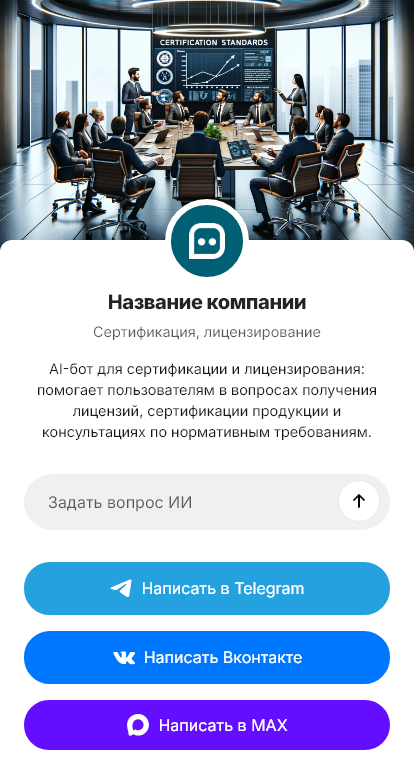 Внедрение настраивается под компанию: перечень услуг, типовые пакеты, сроки и этапы, правила работы с лабораториями, стоимость, интеграция с CRM. Бот помогает объяснить последовательность: анализ → подбор схемы → сбор документов → испытания/проверка → оформление → выдача.