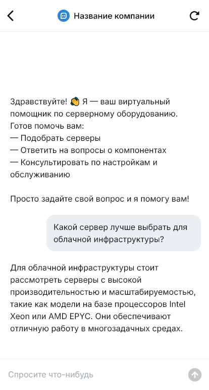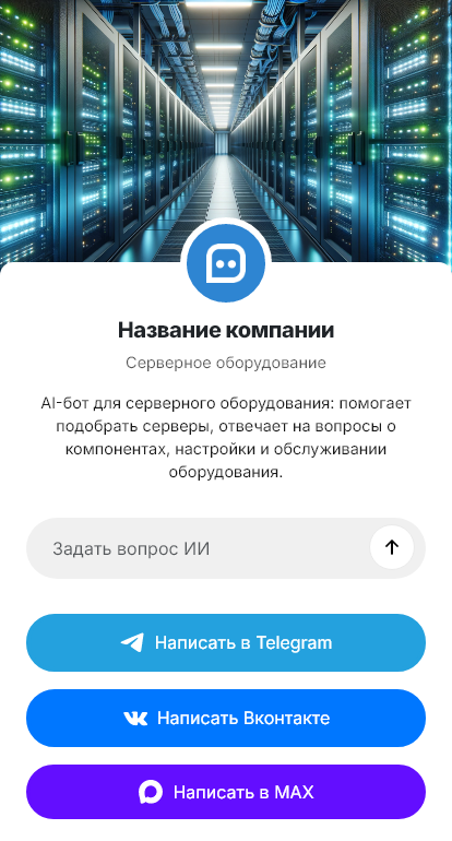 Бот для поставщика серверов помогает собрать параметры и подготовить техническое решение. Он уточняет, для каких сервисов нужен сервер, сколько пользователей, какие нагрузки по CPU/RAM/IOPS, объёмы хранения, требования к RAID, резервному копированию, отказоустойчивости и масштабированию. Бот уточняет форм‑фактор (tower/rack), наличие стойки, электропитание, охлаждение, требования к удалённому управлению и сетевым интерфейсам.