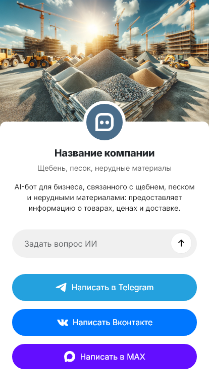 Бот работает в Telegram, ВК, MAX и на сайте 24/7, ускоряет обработку обращений и помогает стабильно превращать запросы на щебень и песок в реальные отгрузки.