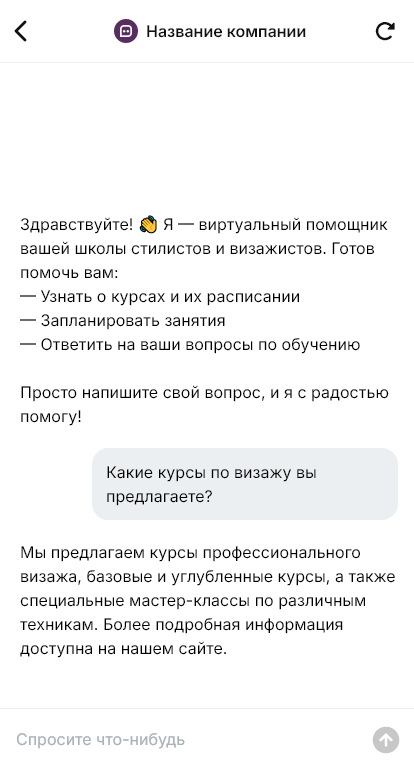 Внедрение настраивается под учебный центр: расписание, уровни, стоимость, рассрочка, правила пропусков, требования к моделям, выдача сертификатов, интеграция с CRM и оплатой. Для корпоративных клиентов (салоны красоты) бот собирает заявки на обучение сотрудников, уточняя количество людей и цели.