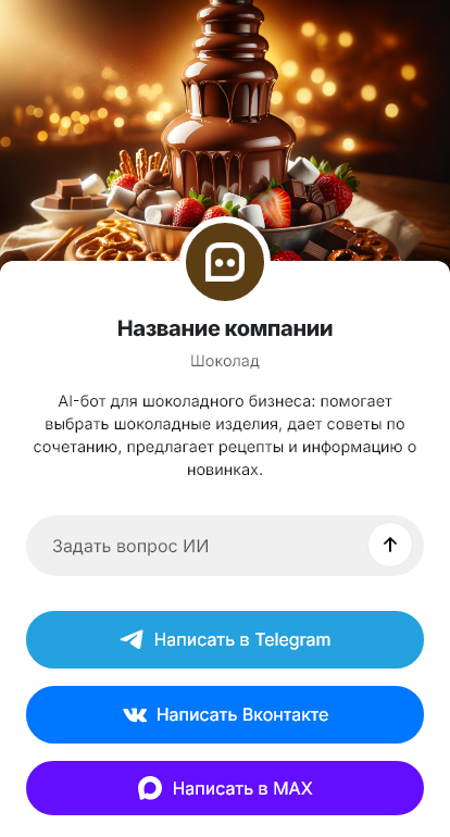 В итоге шоколад продаётся стабильнее, потому что выбор становится лёгким и приятным. Бот работает в Telegram, VK, MAX и на сайте, превращая вопрос «что взять» в оформленный заказ.