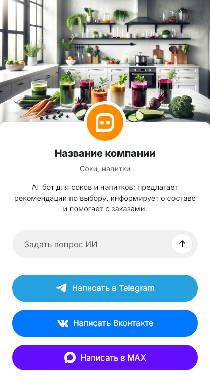 В результате соки и напитки продаются стабильнее, потому что сервис становится быстрым и понятным. Бот работает в Telegram, VK, MAX и на сайте, превращая вопросы о составе и наличии в оформленные заказы.
