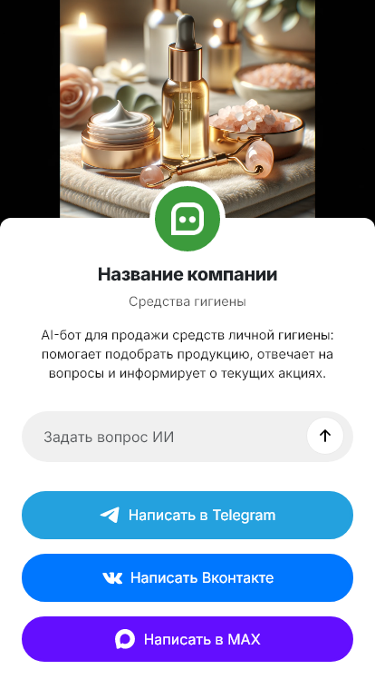 В итоге средства гигиены продаются стабильнее, а клиент получает быстрый сервис и удобный повторный заказ. Бот работает в Telegram, VK, MAX и на сайте, превращая вопросы о наличии в покупки.