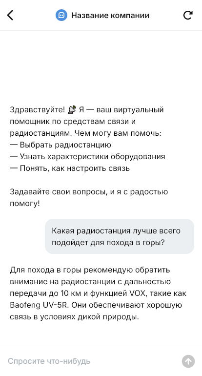 Внедрение настраивается под ваш ассортимент: наличие, аналоги, комплекты, оптовые условия, доставка, гарантия, интеграция с CRM и оплатой. Бот может вести поддержку по типовым вопросам: как заряжать, как настроить каналы, что делать при помехах.