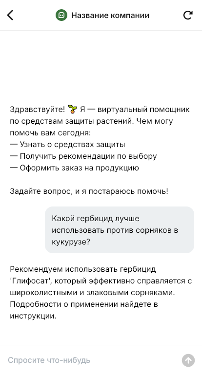 В итоге средства защиты растений выбираются быстрее и точнее, агроном получает поддержку в удобном канале, а поставщик повышает качество сервиса и повторные продажи благодаря боту.