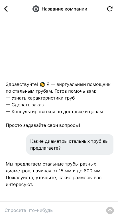 Чат-бот уточняет тип трубы и назначение, размеры, стандарт/ГОСТ (если известен), количество (метры/тонны/штуки), требования по резке, фаске, покрытию, упаковке и доставке. По сценарию бот принимает спецификацию или список позиций, фиксирует адрес отгрузки и сроки. Для организаций бот может собирать реквизиты и формировать заявку на счёт и документы.