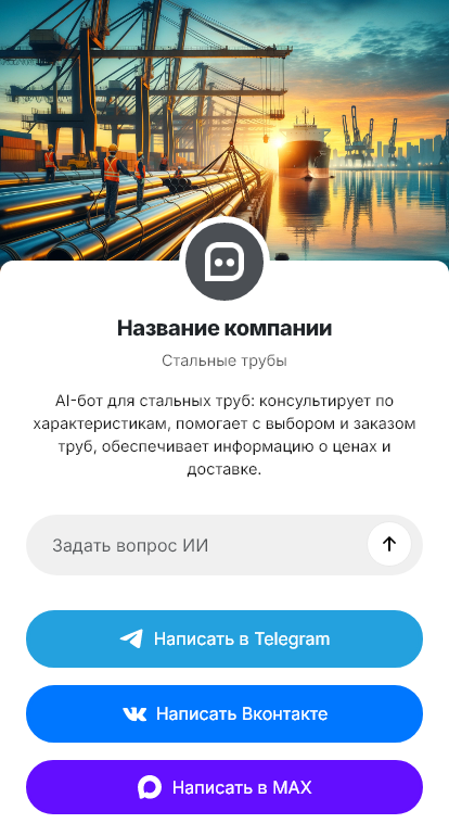 Бот работает в Telegram, ВК, MAX и на сайте 24/7, повышая скорость ответа и конверсию запросов по стальным трубам в реальные отгрузки.