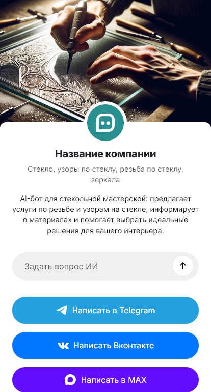 Бот работает в Telegram, ВК, MAX и на сайте 24/7, повышает скорость ответа, качество брифа и конверсию обращений в реальные заказы на стекло и зеркала.