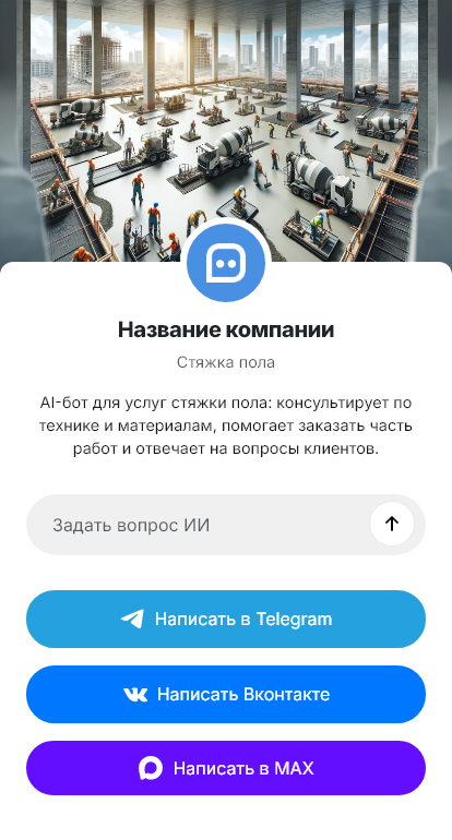 Бот работает в Telegram, ВК, MAX и на сайте 24/7, повышает скорость реакции и конверсию обращений в реальные заказы на стяжку пола.
