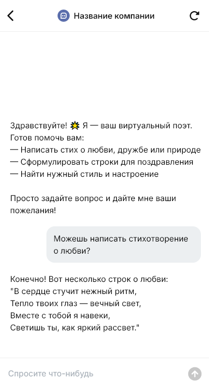 Бот для автора стихов помогает мягко собрать задачу и превратить чувства в конкретный бриф. Он уточняет повод, кому посвящено, характер отношений, ключевые факты и детали, желаемую тональность (романтично, с юмором, серьёзно), длину, формат (открытка, тост, письмо), сроки и бюджет. Бот может предложить примеры разных стилей и помочь выбрать направление, чтобы клиент почувствовал уверенность.