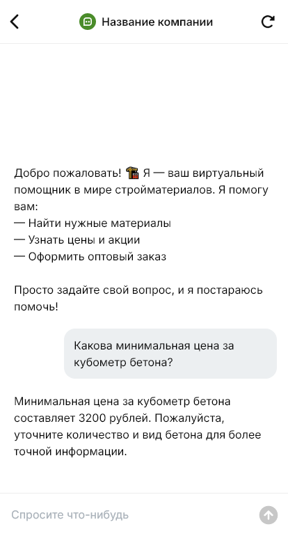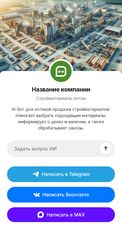 Чат-бот уточняет категории материалов, объёмы, адрес и сроки, условия оплаты, собирает контакты и реквизиты и передаёт заявку менеджеру. Для типовых вопросов бот отвечает по доставке, минимальным партиям и документам.
