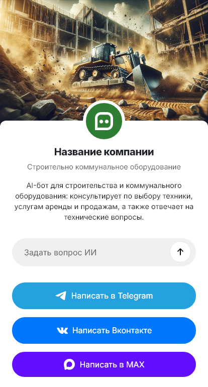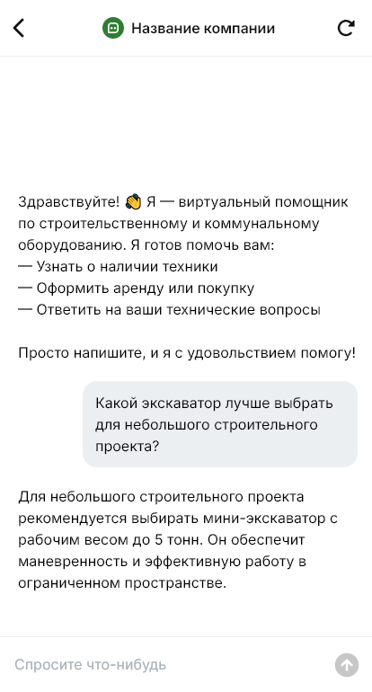 Бот для продажи строительно-коммунального оборудования помогает уточнить задачу и собрать параметры. Он спрашивает, для каких работ нужна техника, площадь и тип территории, условия эксплуатации (город, склад, стройка), сезонность, желаемую производительность, требования к навесному оборудованию, бюджет и сроки. Если речь о муниципальных закупках, бот может уточнить требования к документации и формату поставки.