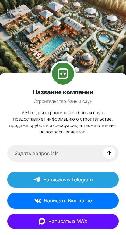 Бот работает в Telegram, ВК, MAX и на сайте 24/7, повышает скорость ответа и конверсию обращений в реальные замеры и договоры на строительство бань и саун.