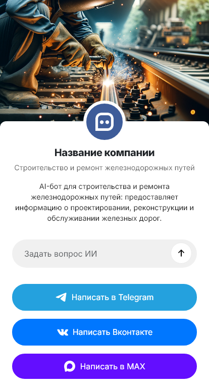 Бот работает в Telegram, ВК, MAX и на сайте 24/7, ускоряет коммуникацию и повышает качество входящих заявок на работы по железнодорожным путям.