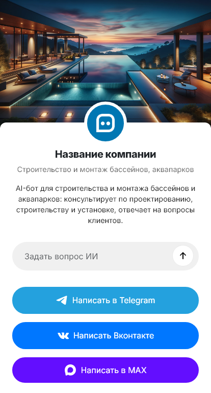 В итоге строительство бассейнов и аквапарков становится более управляемым. Бот работает в Telegram, VK, MAX и на сайте, повышает качество входящих запросов, ускоряет подготовку коммерческого предложения и помогает довести клиента до ввода объекта в эксплуатацию и регулярного обслуживания.